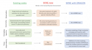 Figure 2: comparison between the state-of-the-art wind codes (left column) and WINE, both the current version and the one including the planned improvements with DRAGON (center and right columns, respectively).