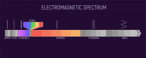 Le regioni dello spettro elettromagnetico sono ordinate secondo la lunghezza d’onda o la loro frequenza e sono definite come in figura. L’occhio è sensibile a una piccola parte dell’intero spettro elettromagnetico, la parte del visibile.